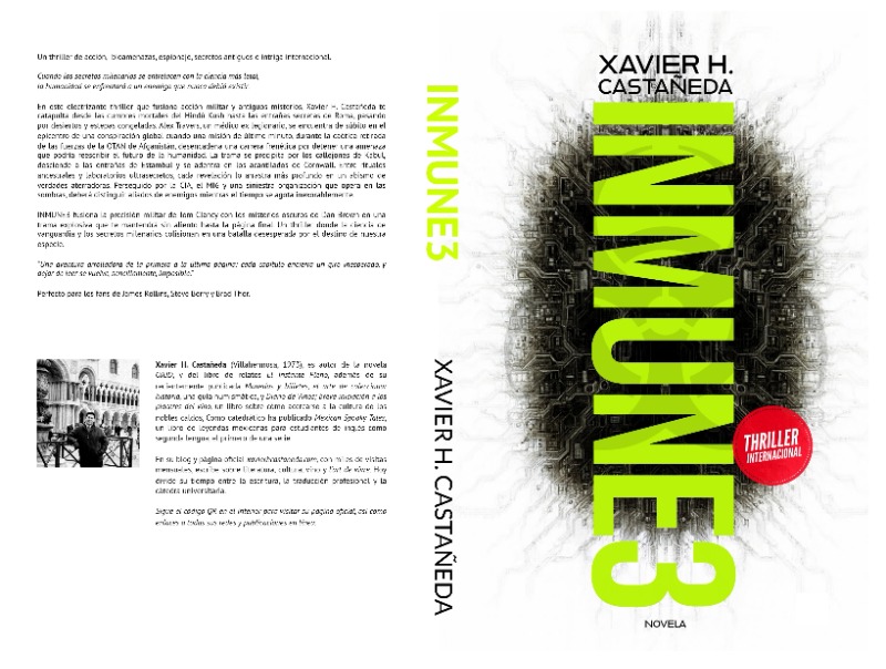 INMUNE3 es una novela de suspense que sigue al operador de la agencia de inteligencia global “Meurice” Alex Travers, mientras desentraña una conspiración de carácter mundial relacionada con un patógeno letal. Con la ayuda de la agente de la CIA Ivy Marks, la epidemióloga Lottie Wright, y de la agente triple Erin Miller, y enfrentándose a traiciones y secretos del pasado, Alex debe navegar por una red de espionaje internacional para detener al principal antagonista, Sir Uther de Bottreaux. La historia se despliega en un escenario de acción y misterio desde las montañas del Hindú Kush hasta Roma, culminando en una confrontación final en Siberia que desvela la verdadera magnitud de la amenaza: un virus de diseño a partir de gérmenes descongelados del permafrost siberiano, contra el cual la humanidad no tiene ninguna defensa. Con personajes complejos y giros sorprendentes, INMUNE3 es una narrativa llena de suspenso y acción, con una intensa trama de secretos militares, descubrimientos místicos, enfrentamientos emocionales y físicos, que se desarrolla a través de saltos entre diferentes lugares y personajes; una lectura emocionante de corte internacional.