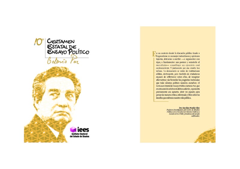 La democracia genera cambios en los países que la practican, y su efectividad depende de las instituciones y de la participación de una ciudadanía activa e informada. Los cambios que en la actualidad está viviendo nuestro país presentan desafíos para las instituciones políticas y electorales, motivo por el cual se eligió “Democracia y Reforma Electoral” como tema del Décimo Certamen Estatal de Ensayo Político “Octavio Paz” 2025, que convoca el Instituto Electoral del Estado de Sinaloa (IEES), y cuyos trabajos ganadores se presentan en este libro.