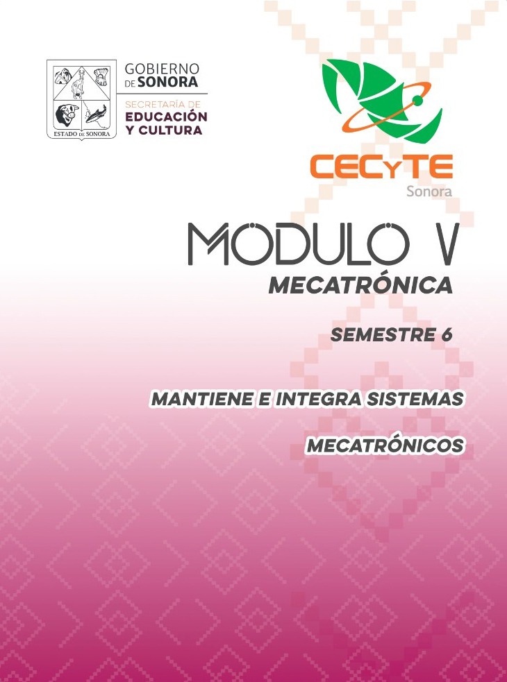 Con el propósito de mantener sistemas mecatrónicos en operación mediante mantenimiento preventivo, predictivo o correcto, de acuerdo a los parámetros de operación y servicio establecidos por el fabricante, utilizando el equipo y herramientas adecuadas, el Colegio de Estudios Científicos y Tecnológicos del Estado de Sonora (CECyTE Sonora) presenta el Módulo V “Mantiene e Integra Sistemas Mecatrónicos” perteneciente al desarrollo de la carrera técnica de Mecatrónica, para su aplicación en el sexto semestre. Este material cuenta como una herramienta de aprendizaje que relaciona la teoría con la practica a través de lecturas y ejercicios diversos encaminados a apoyar el desempeño en el alumno, compuesto de tres unidades referentes a la identificación de elementos y ejecución en los procedimientos de mantenimiento, la determinación de desviaciones y la reparación de fallas en los sistemas mecatrónicos.